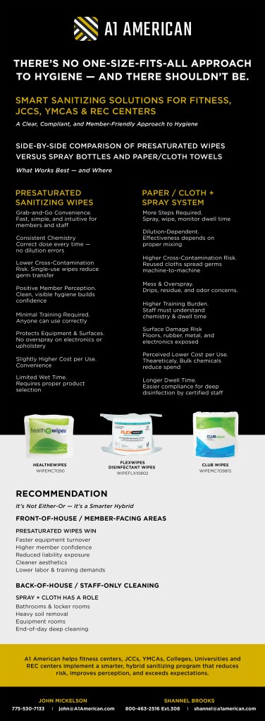 Pre-saturated sanitizing wipes have emerged as the clear winner in front-of-house, member-facing areas, where speed, simplicity, and perception matter most. They deliver consistent chemistry, reduce cross-contamination risk, protect equipment, and create a clean, professional experience members can see and trust.